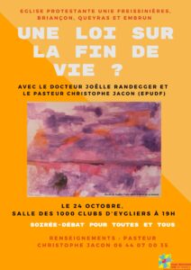 Les deux intervenants présenteront ces enjeux : le Docteur Joëlle Randegger se focalisera sur les enjeux médicaux et le pasteur Christophe Jacon sur les enjeux théologiques (abordés d’un point de vue protestant)