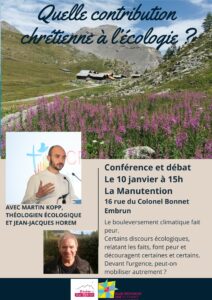 En partenariat avec l’Eglise catholique de Guillestre et d’Embrun, nous faisons venir Martin Kopp, président de la commission Ecologie et justice climatique à la FPF, délégué de la FPF à de nombreuses COP, dont la COP 21.